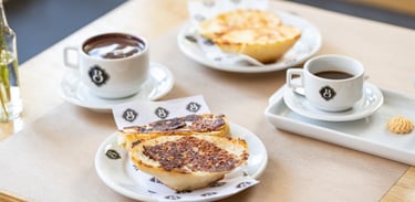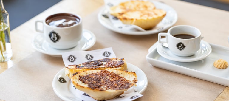 Oferecemos uma variedade de cafés, cappuccinos e bebidas quentes, além dos clássicos matinais que são pura tradição — como o pão na chapa quentinho e crocante, o misto quente e os croissants.